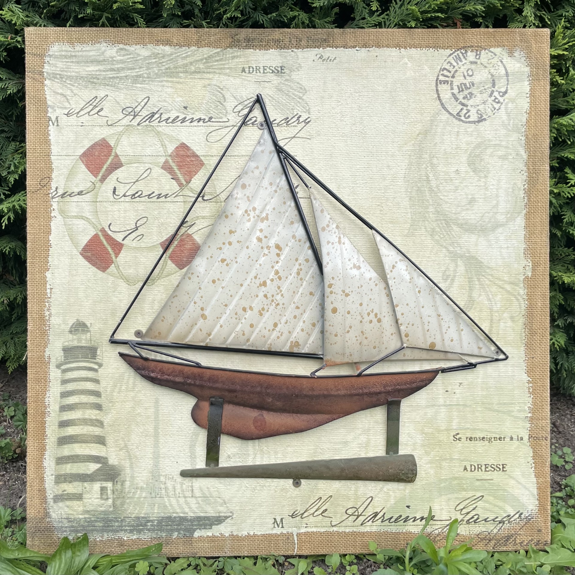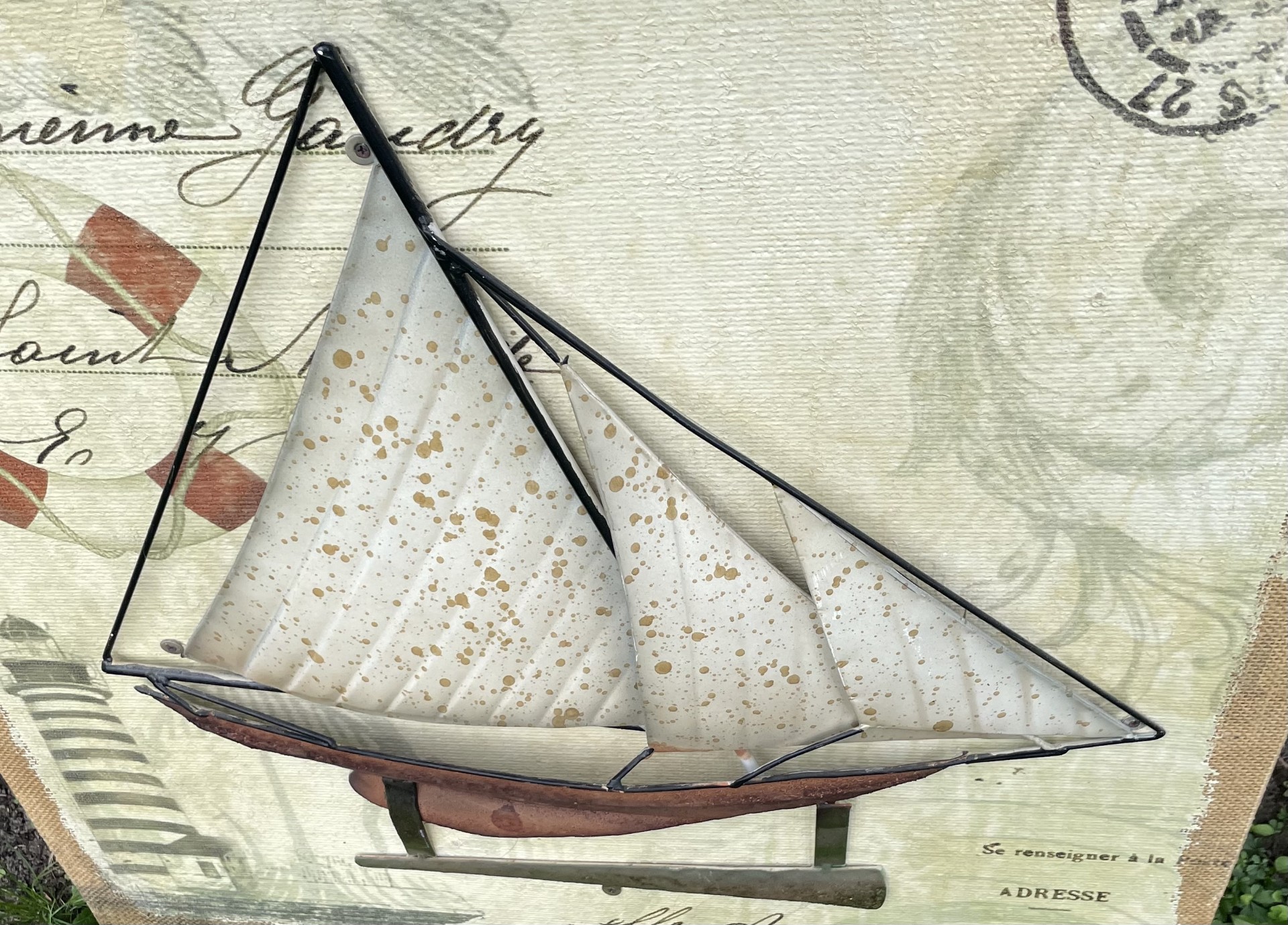 Unique metal picture of a sailing vessel in 3D with a kind of postcard feel to it.