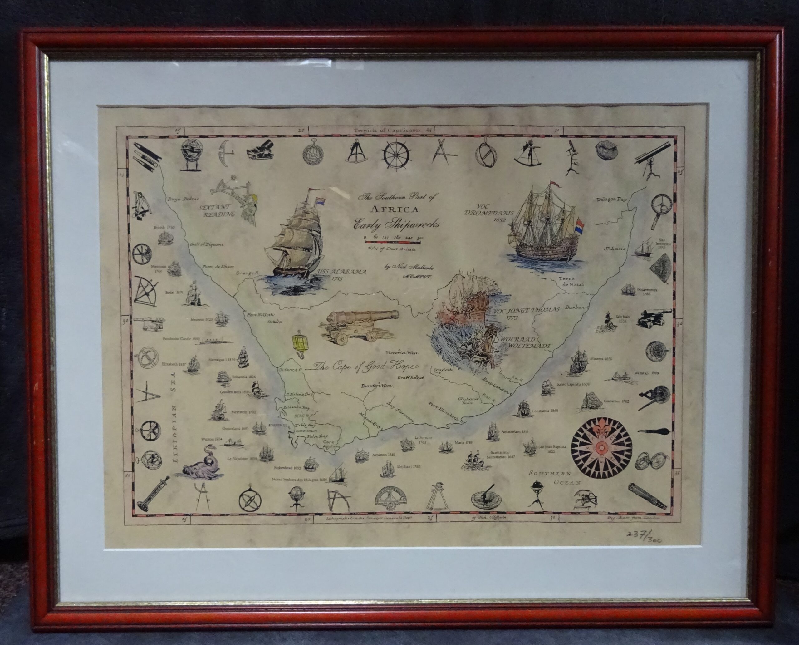 Fascinating Nick Malherbe map of early shipwrecks on the Southern African coast, mounted, framed and glazed, limited to 300 copies.