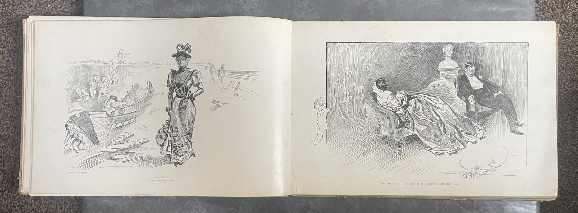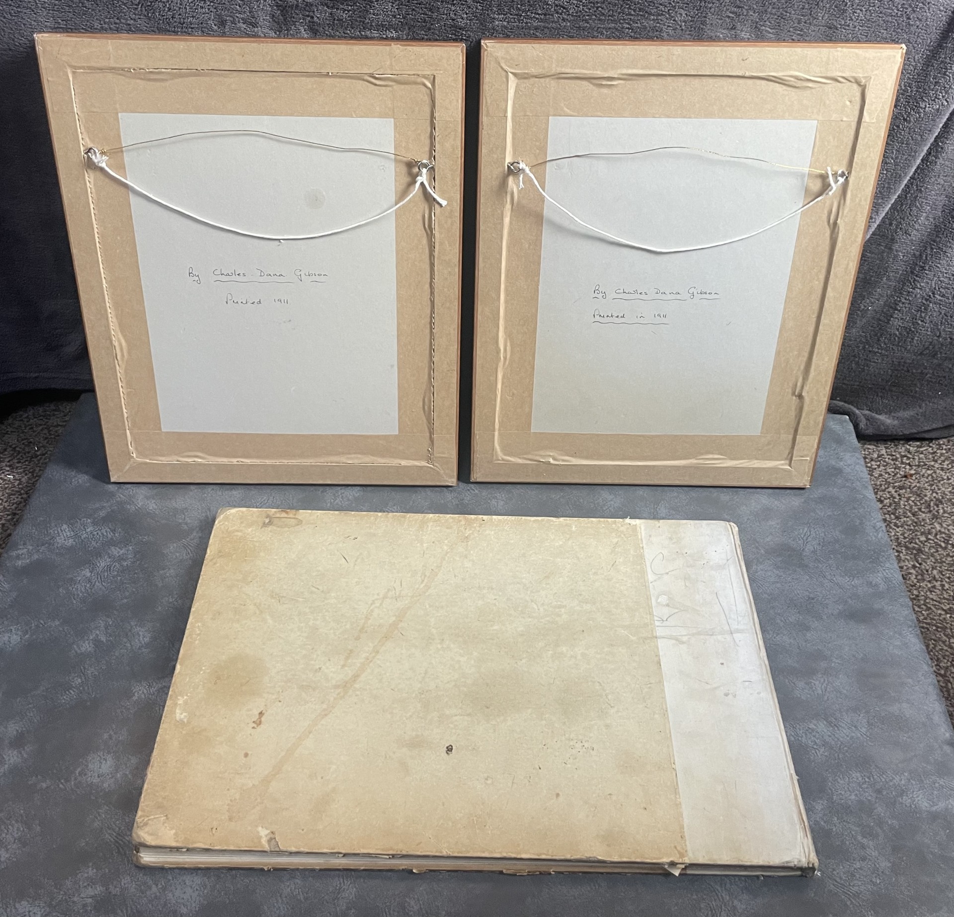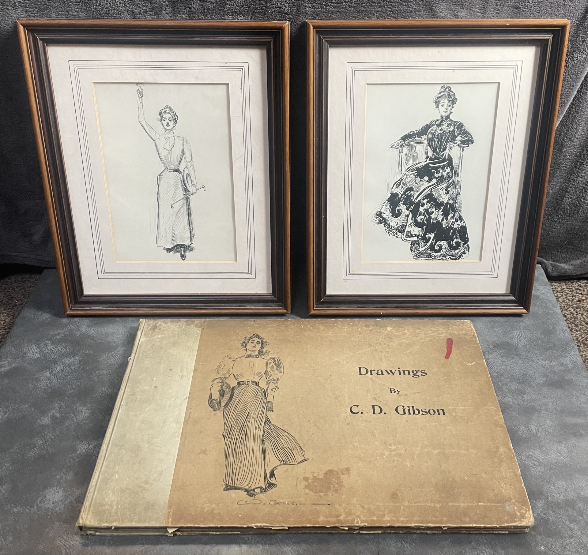 Wonderful rare and large ‘Drawings’ book of lithograph prints in great condition by Charles Dana Gibson, along with two ‘Gibson Girl’ framed and glazed prints, each measuring approx. 16 x 13 inches.
