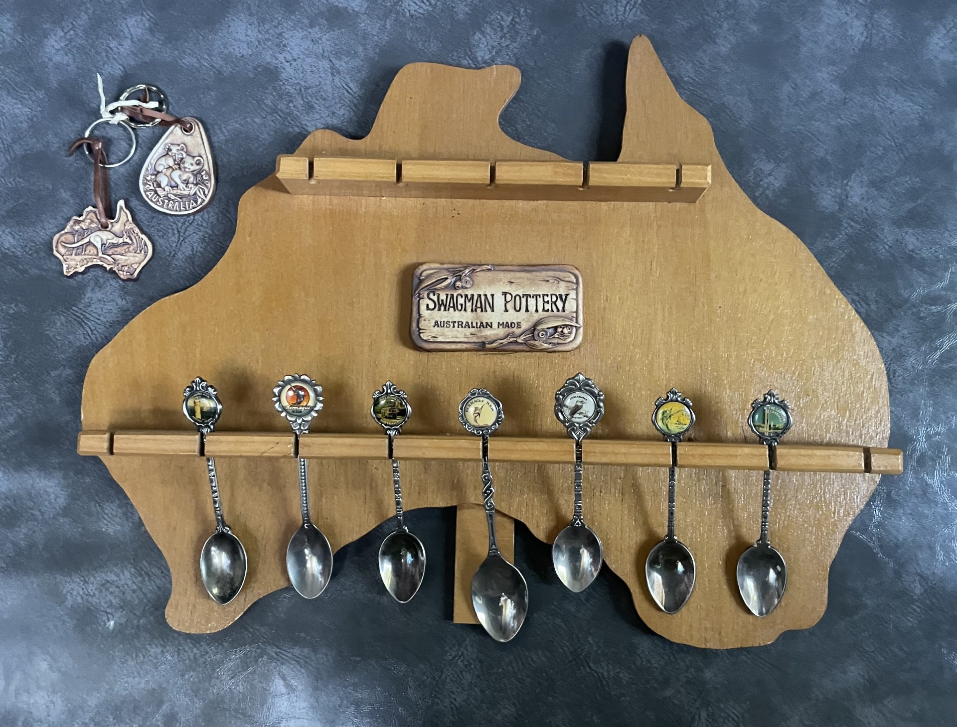 A great fun item from Oz, with seven vintage Aussie-Themed collectible silver spoons and a free-standing display board that can be hung on a wall if preferred. Plus, a couple of key rings.