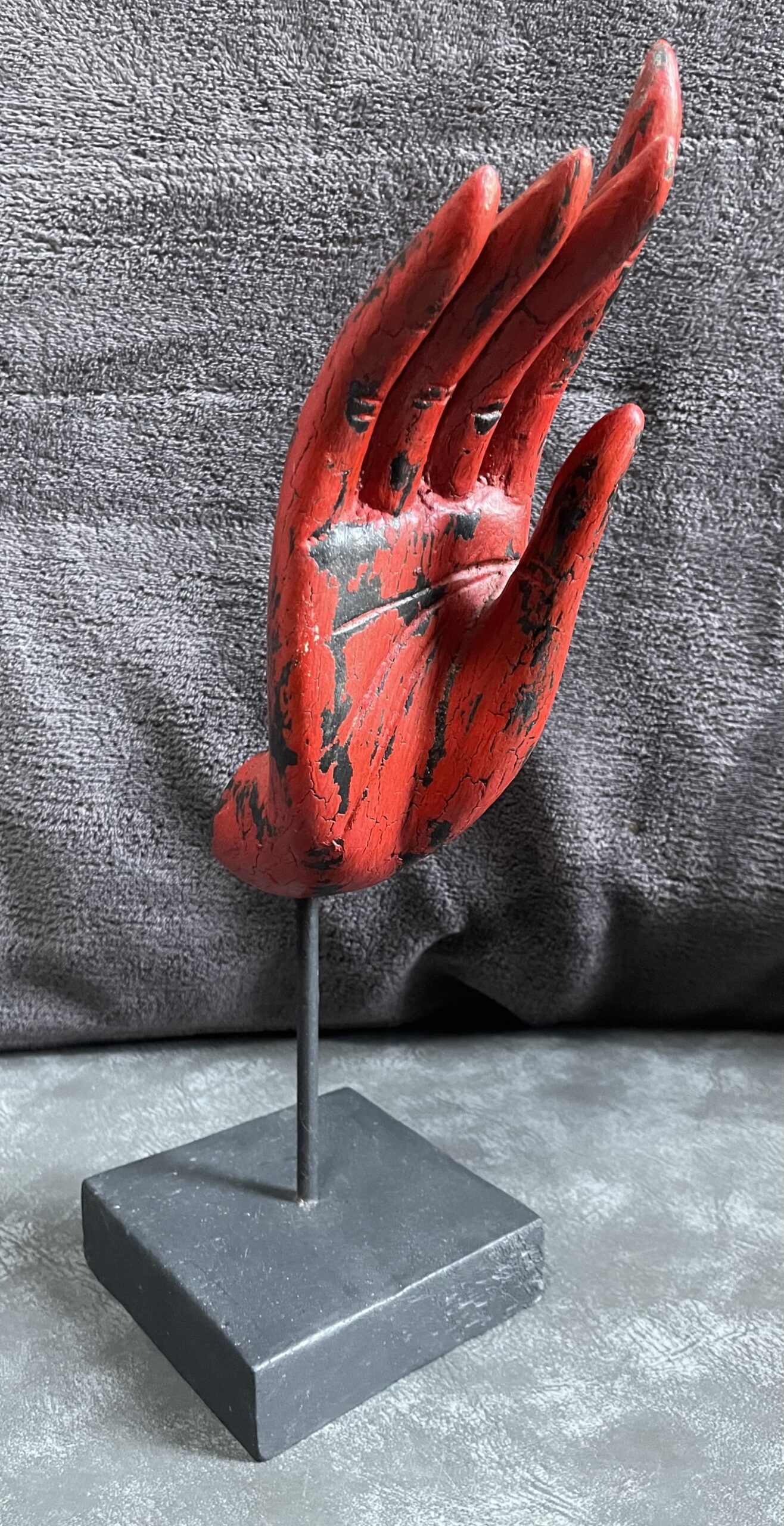 “Your version of the hand sculpture shows a gesture (mudra) that is said to help guide during meditation practice towards the transmission of the Buddha’s teachings. The saying goes that the hand is there to assist with the transfer of knowledge, and to help remove any fear or obstructive thoughts.