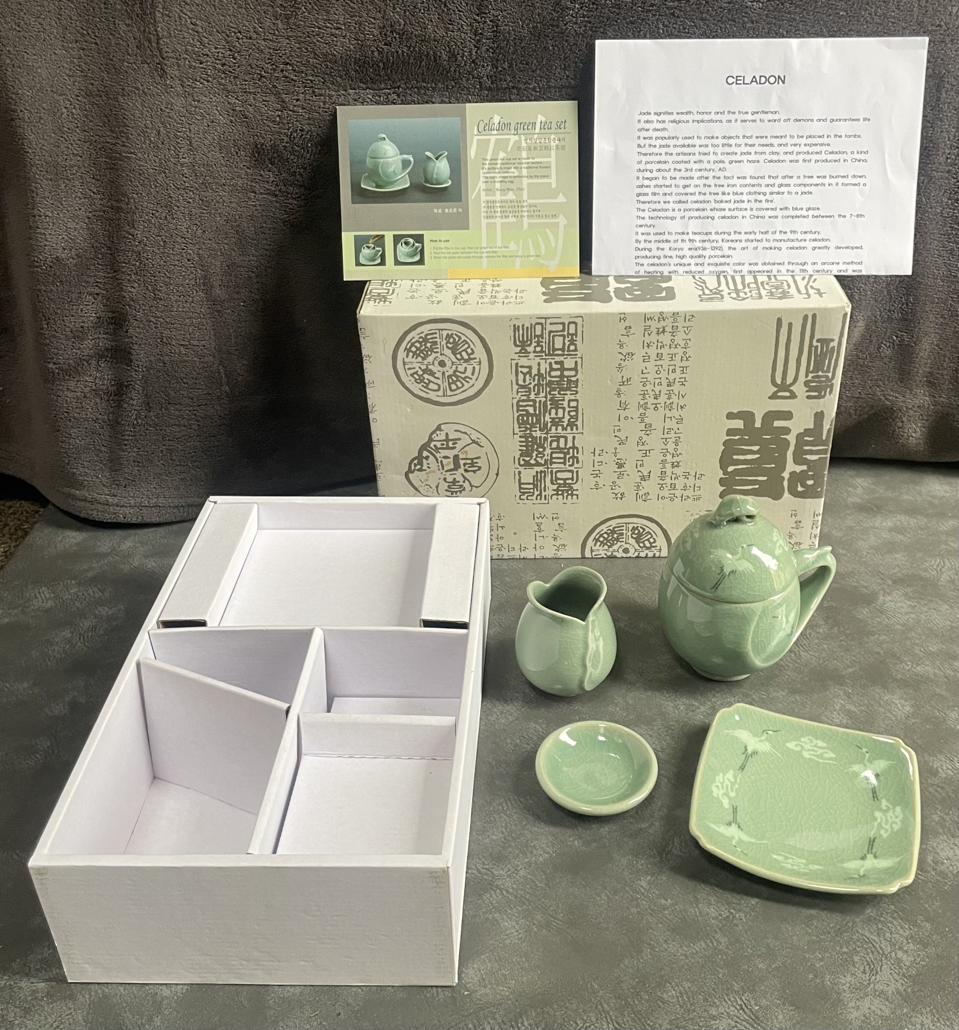 Vintage unused Celadon green tea set in box with papers.