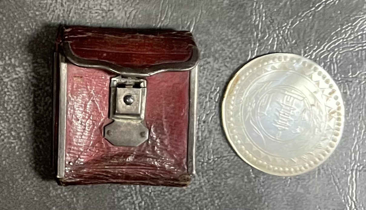 19th century hand-crafted mother of pearl gaming token with original leather case.