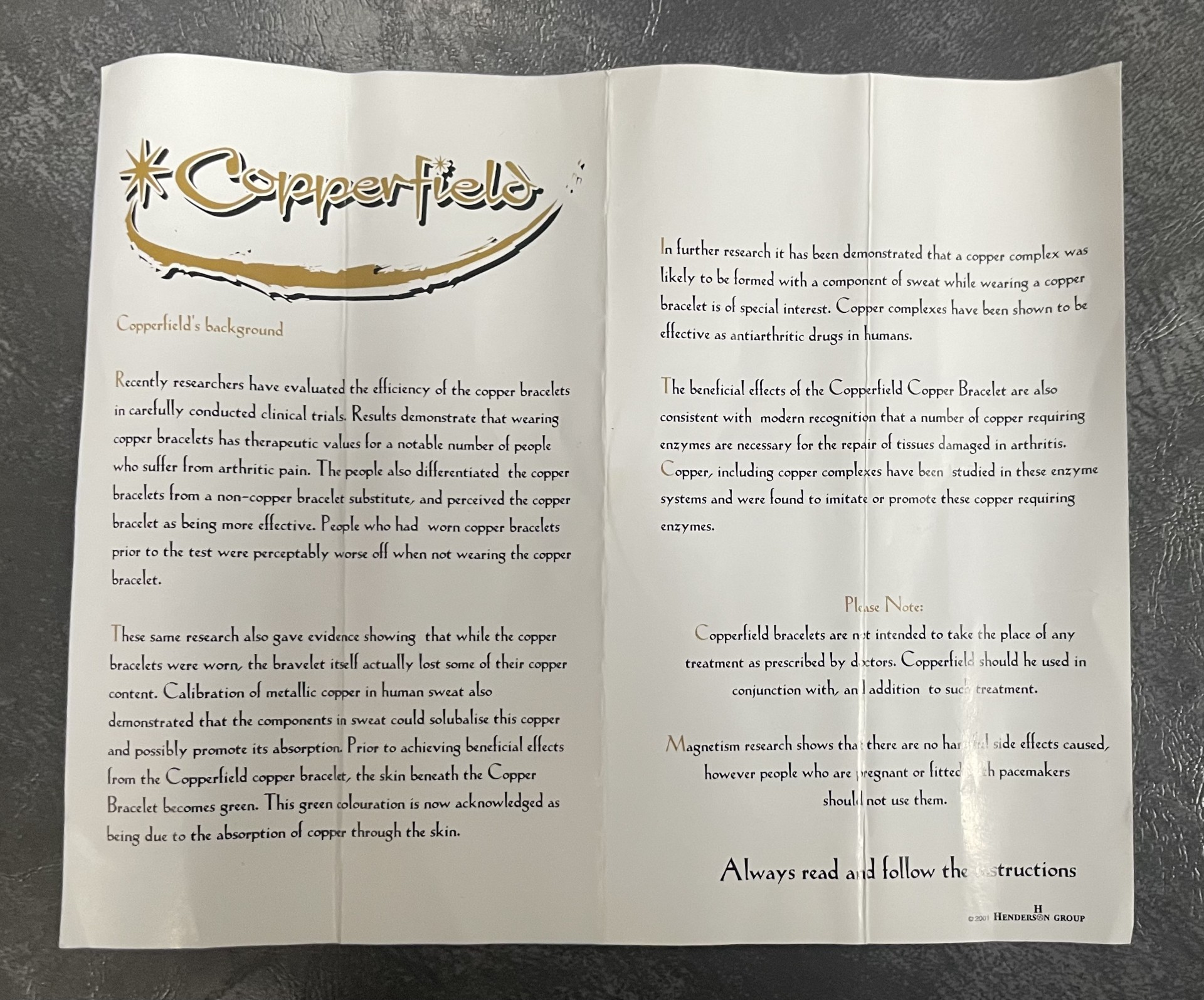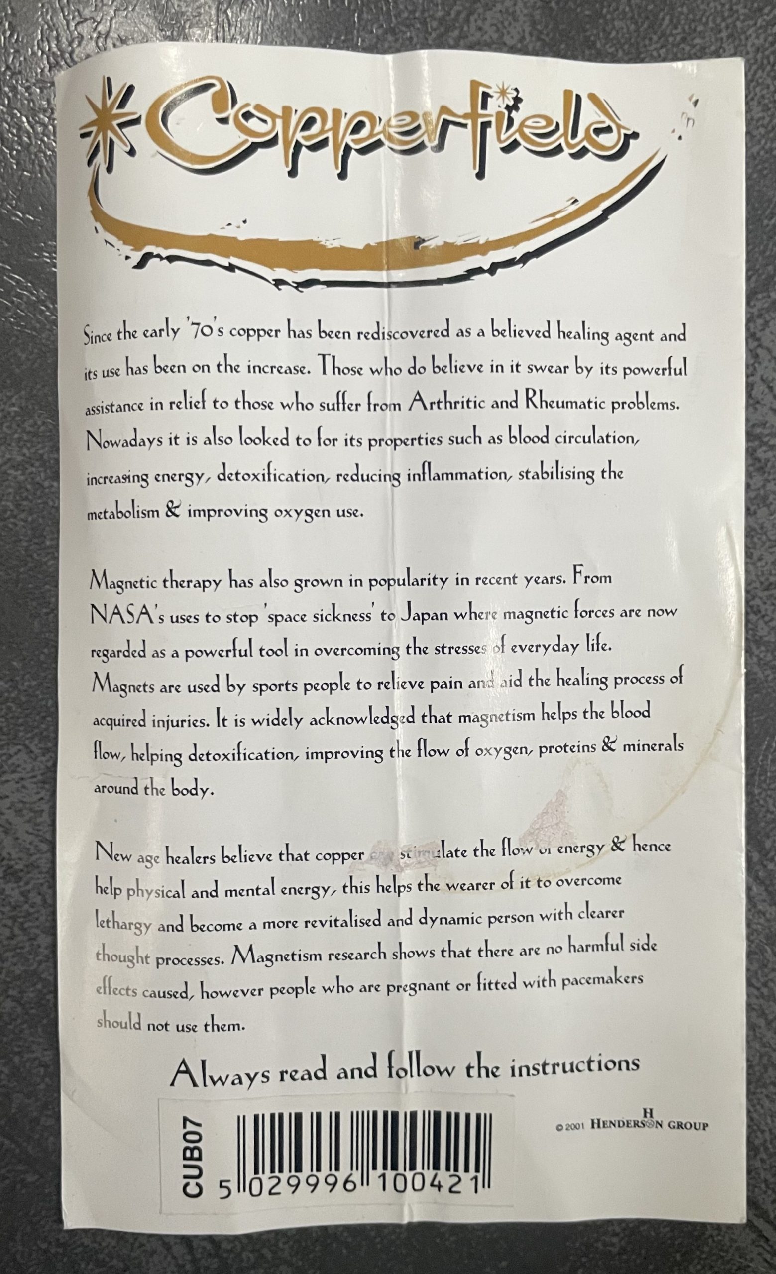 The healing qualities of wearing copper has been long established and is detailed in the leaflet that comes with this magically marvellous watch.