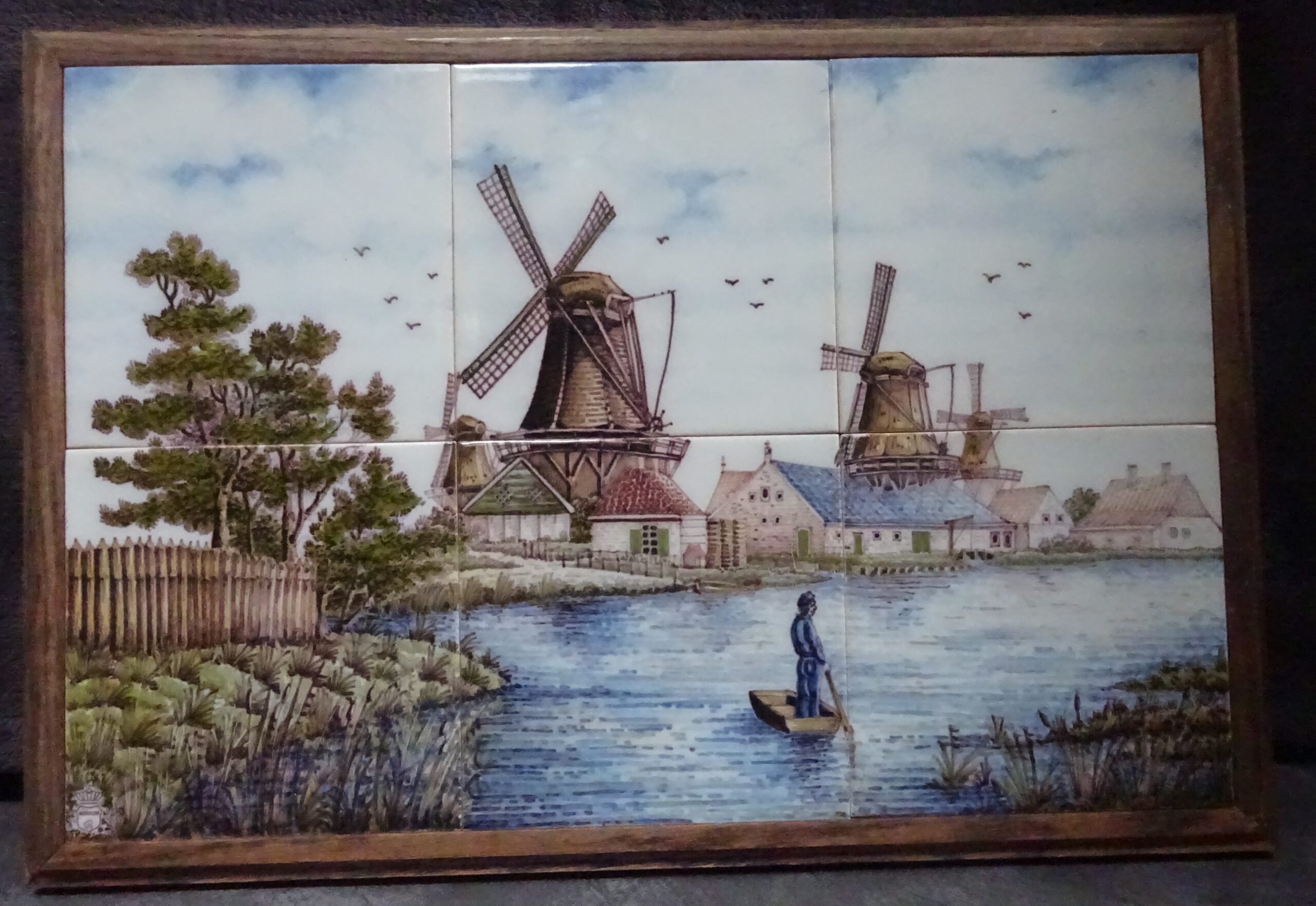 Very rare vintage six-tiled Delft Makkum Dutch scene painting in well-suited frame.