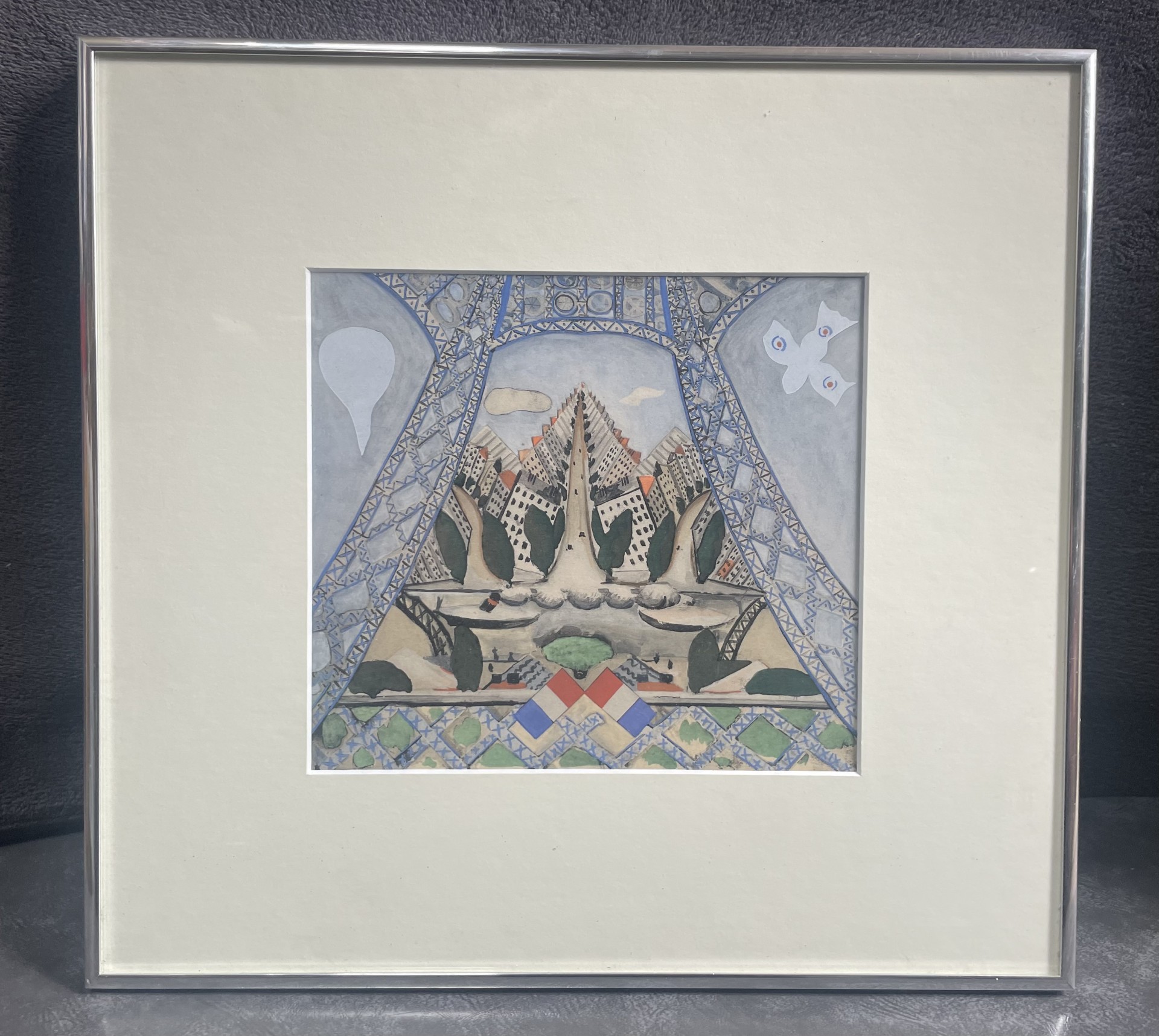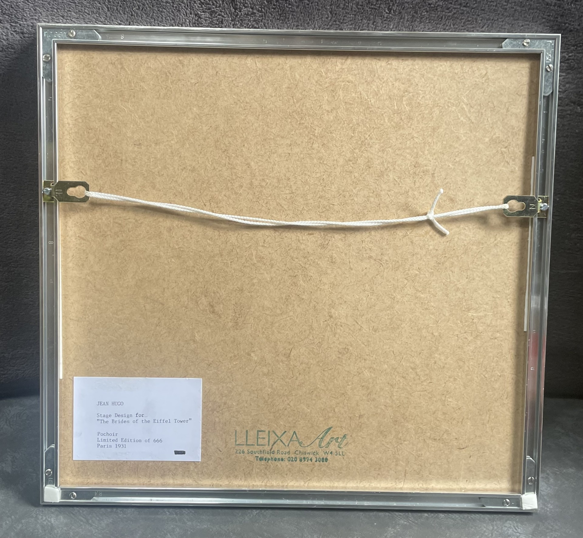 Framed and glazed stage design pochoir for Les Mariés de la tour Eiffel (‘The Wedding Party on the Eiffel Tower’)  by Victor Hugo’s great grandson.