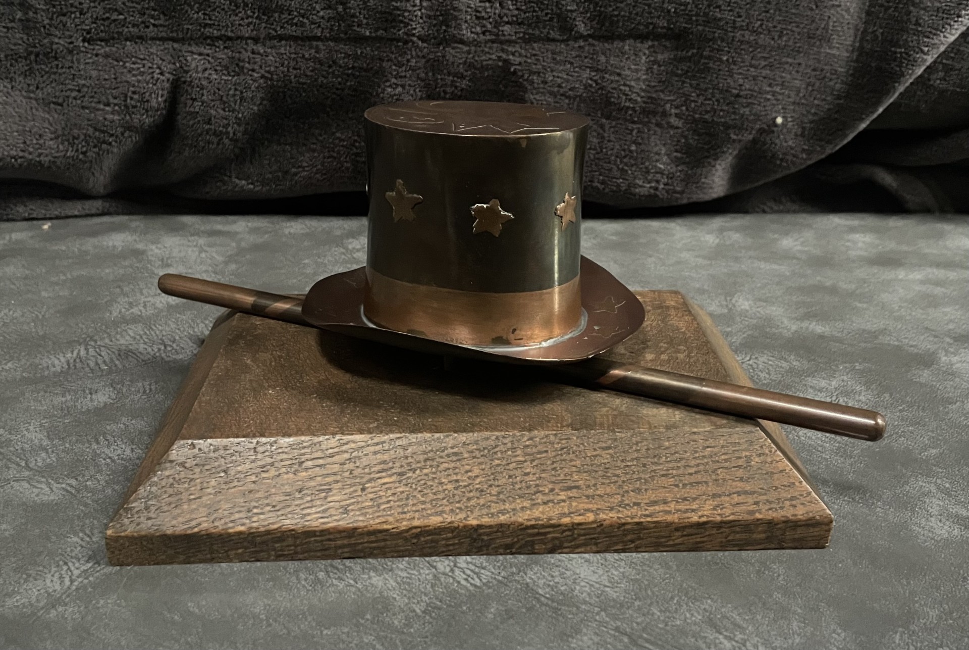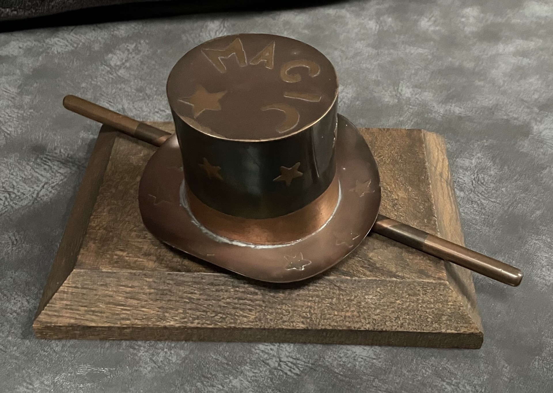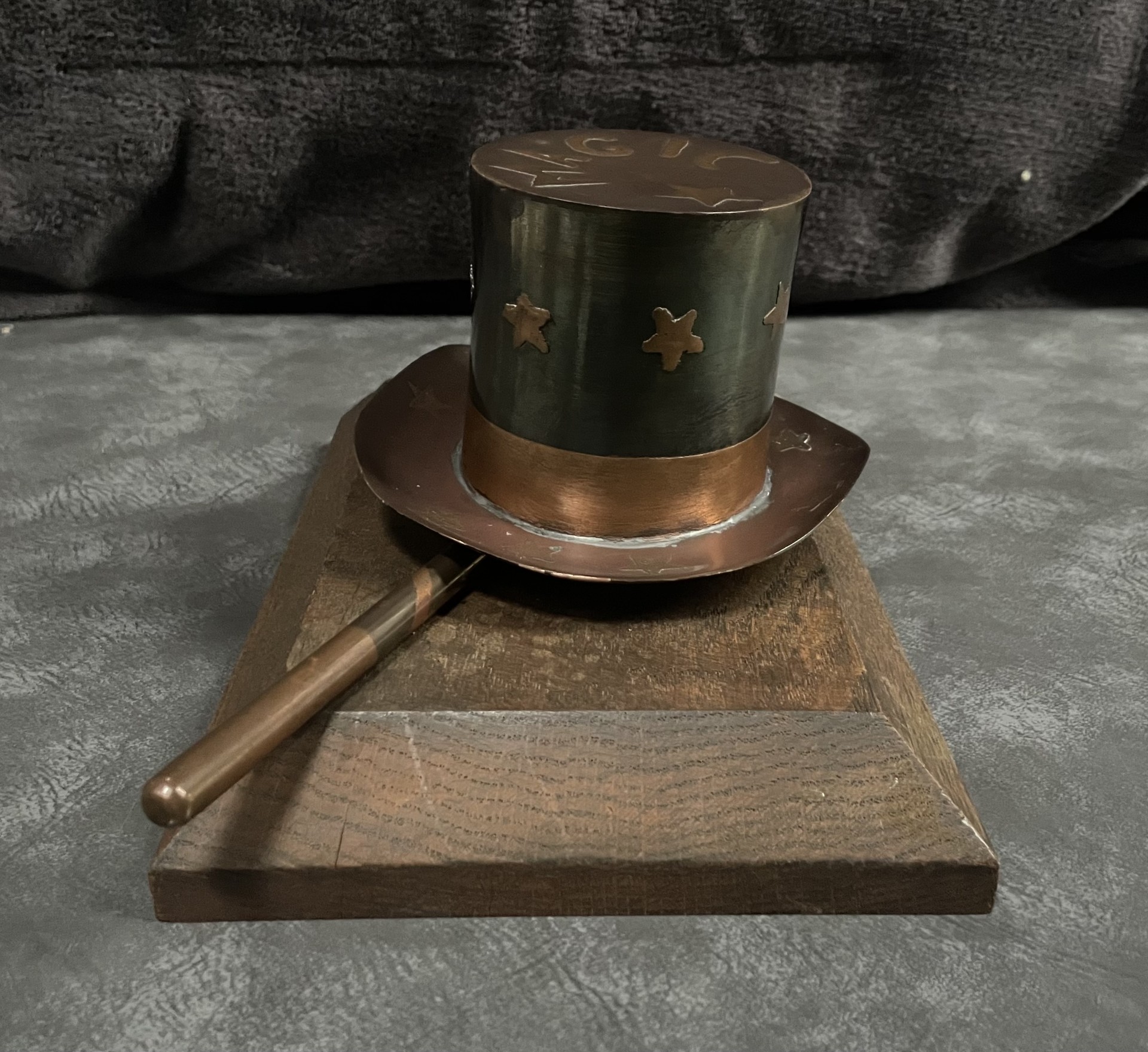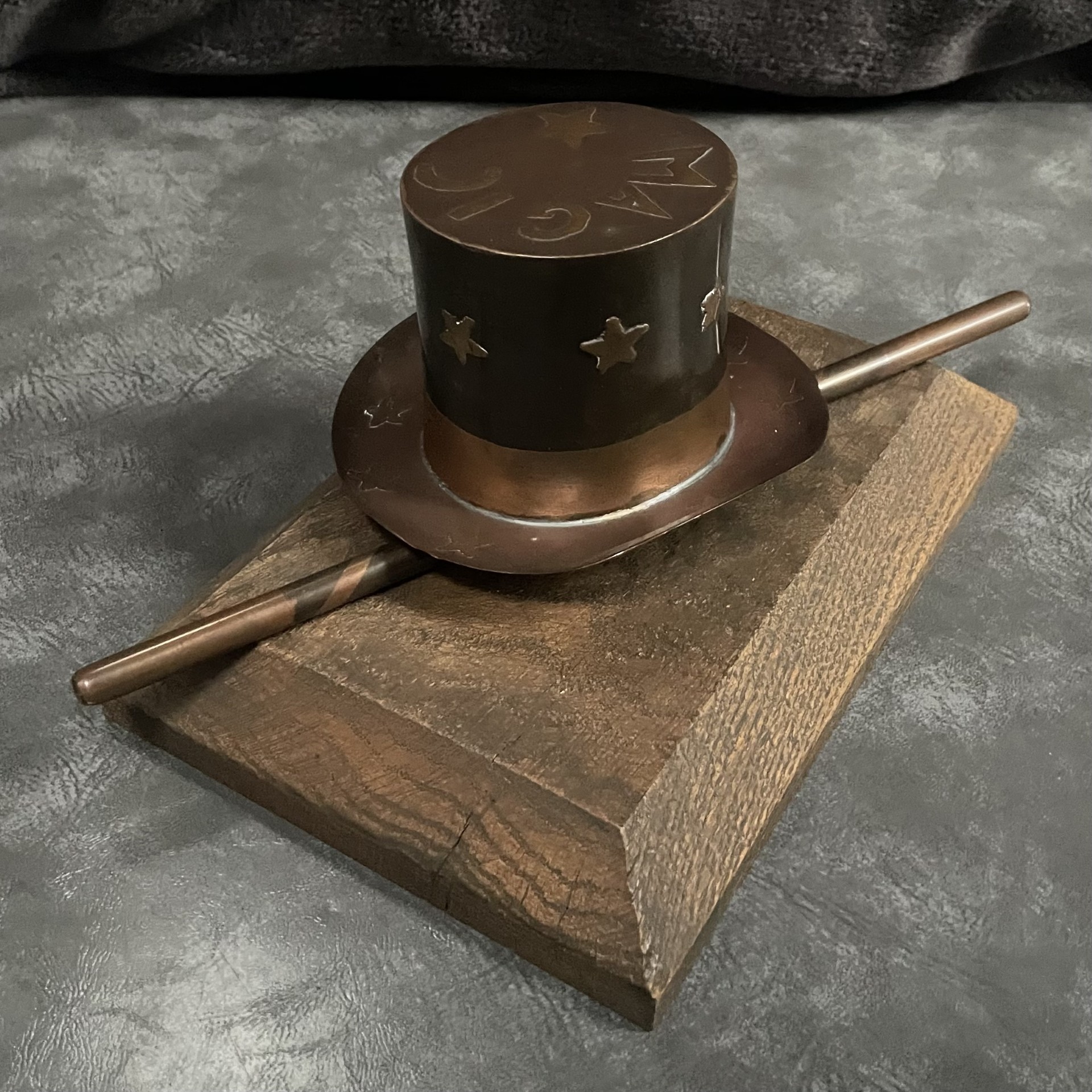 Unique Metal Sculpture of Magician’s Hat & Wand on Wooden Base
