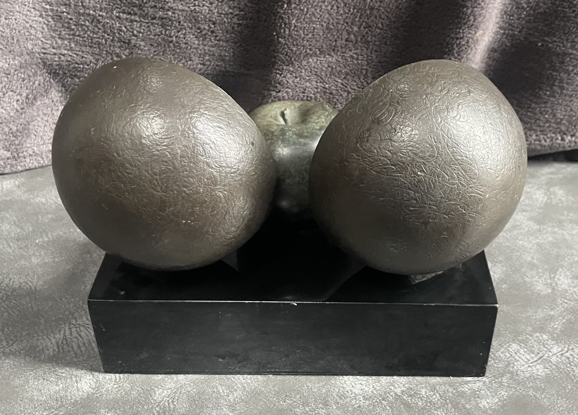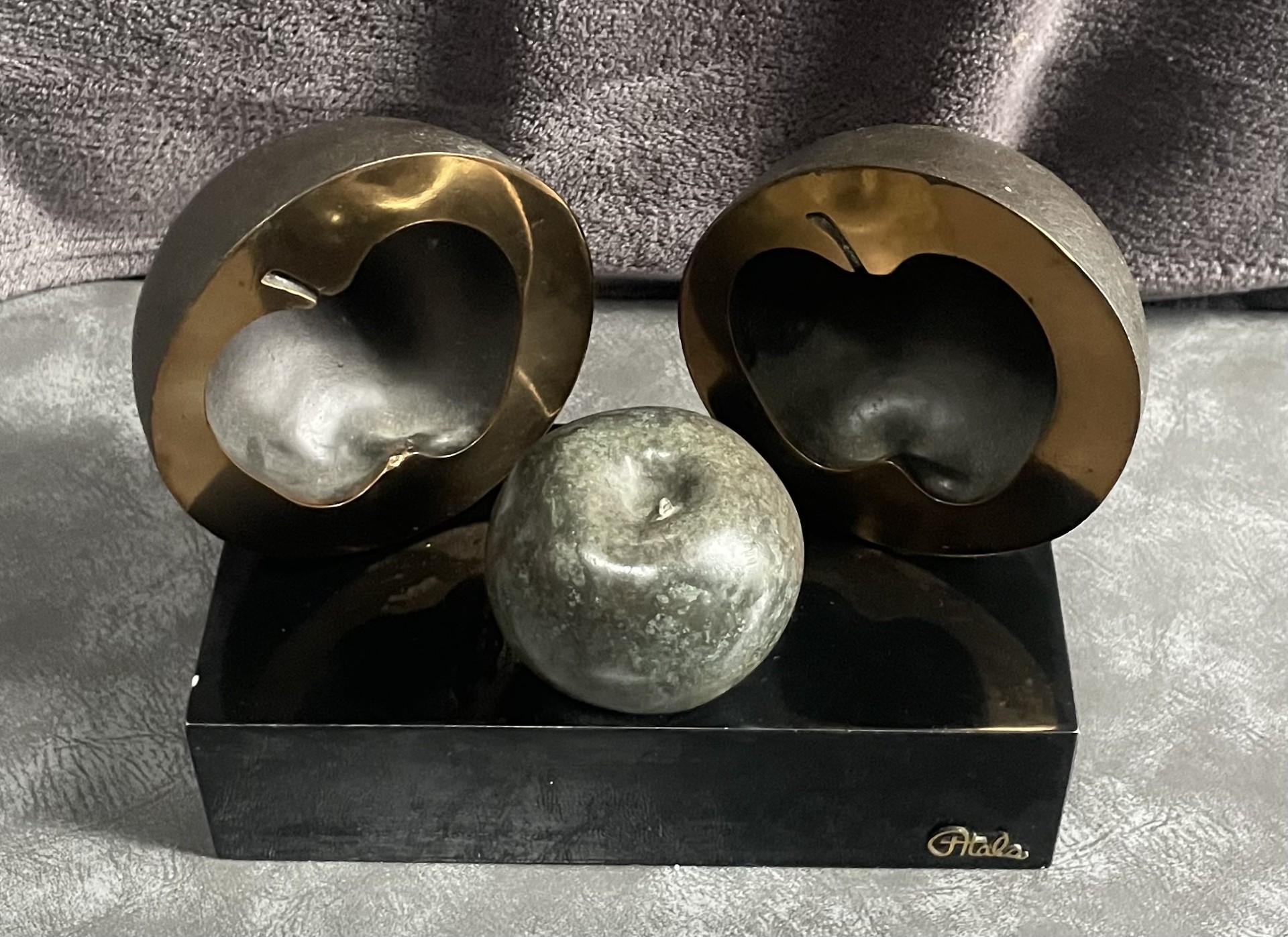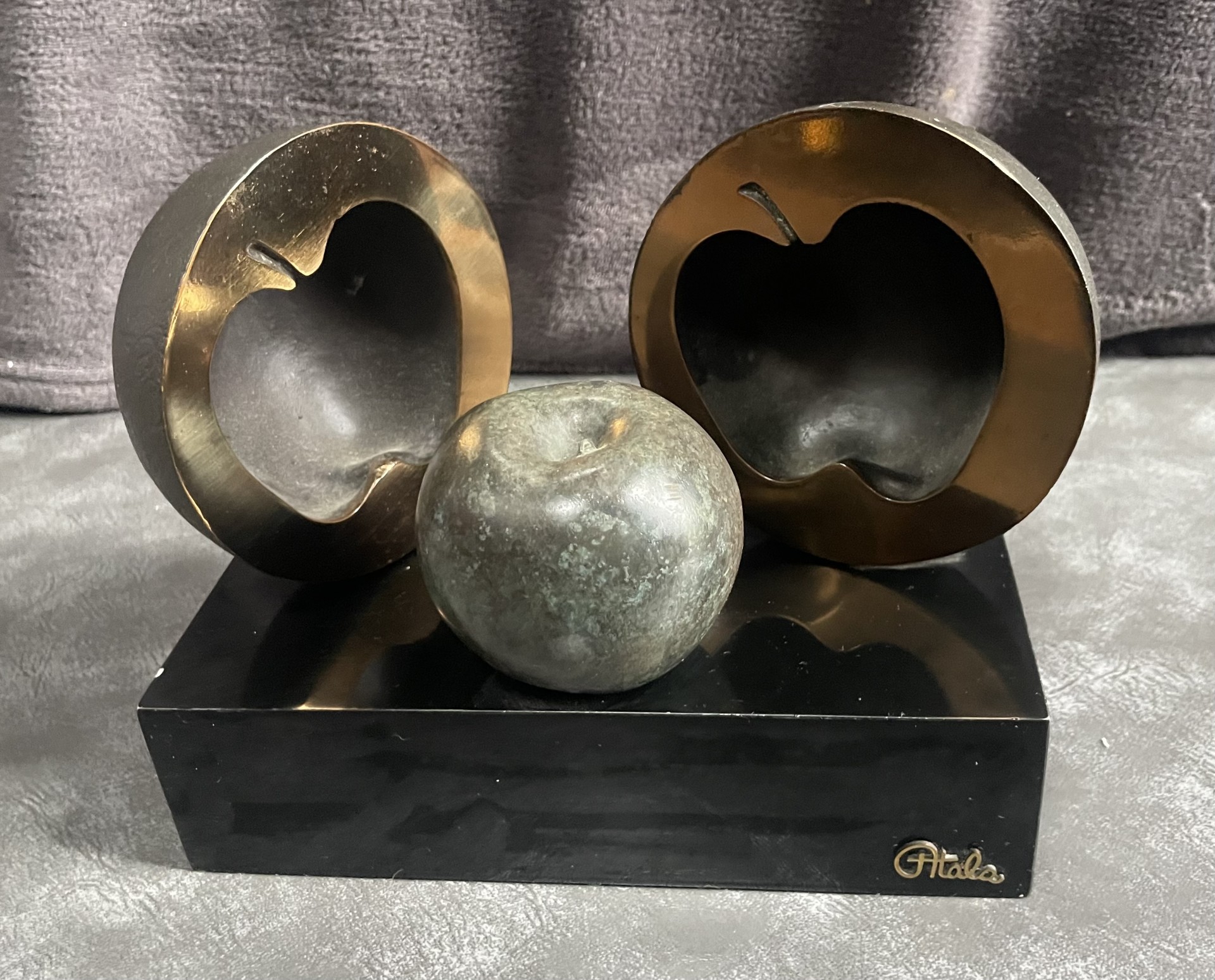 Classy patinated bronze apple sculpture with it’s two halves that can be rotated a little for slightly different impressions and also can be taken off for cleaning purposes, set on a deep black plinth.