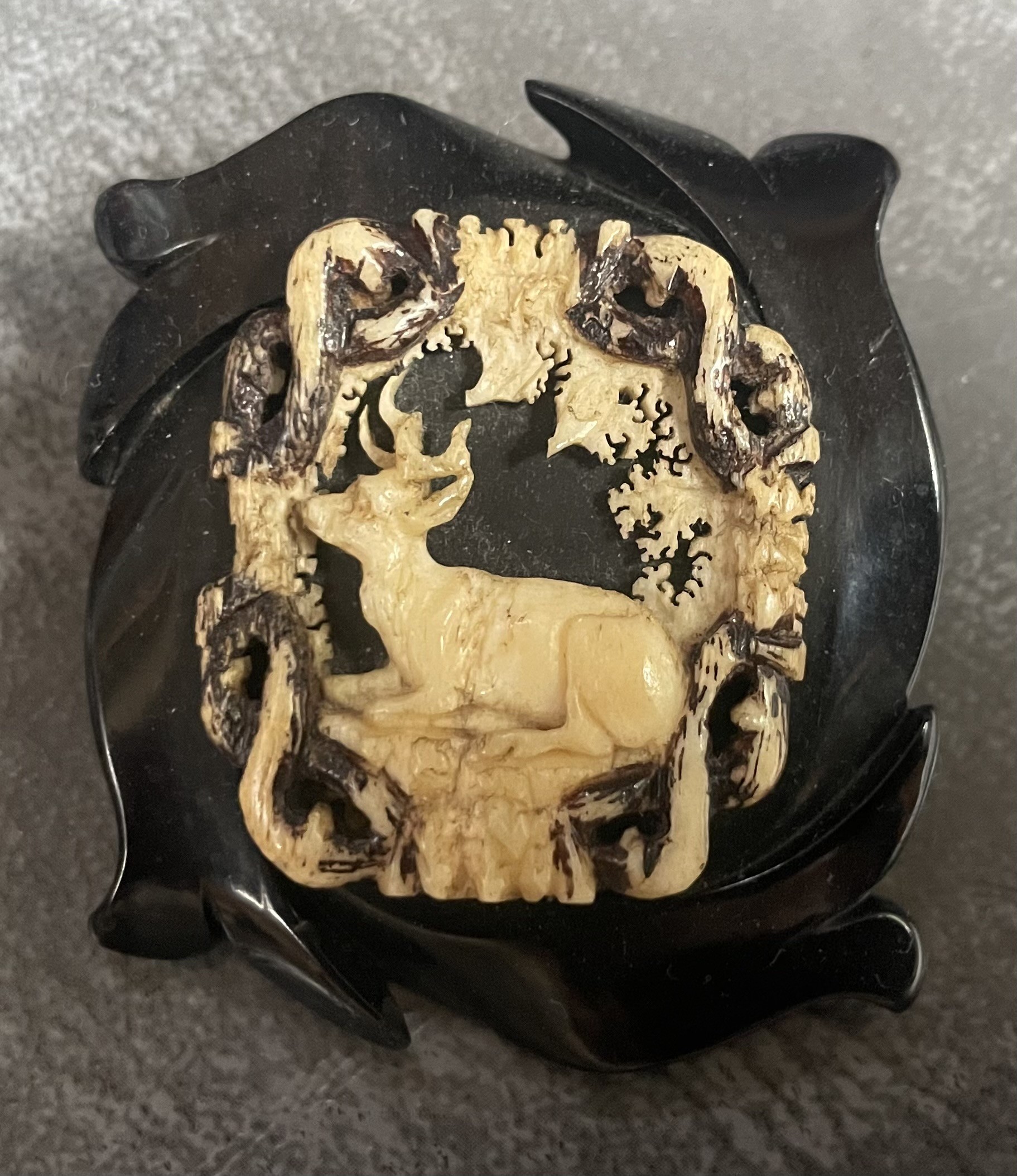 Beautiful 2 inch square 19th Century brooch with bone stag carving