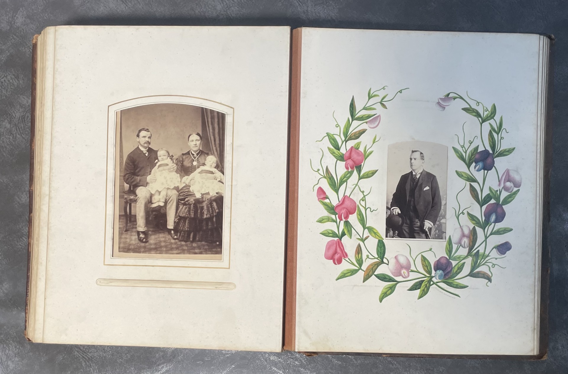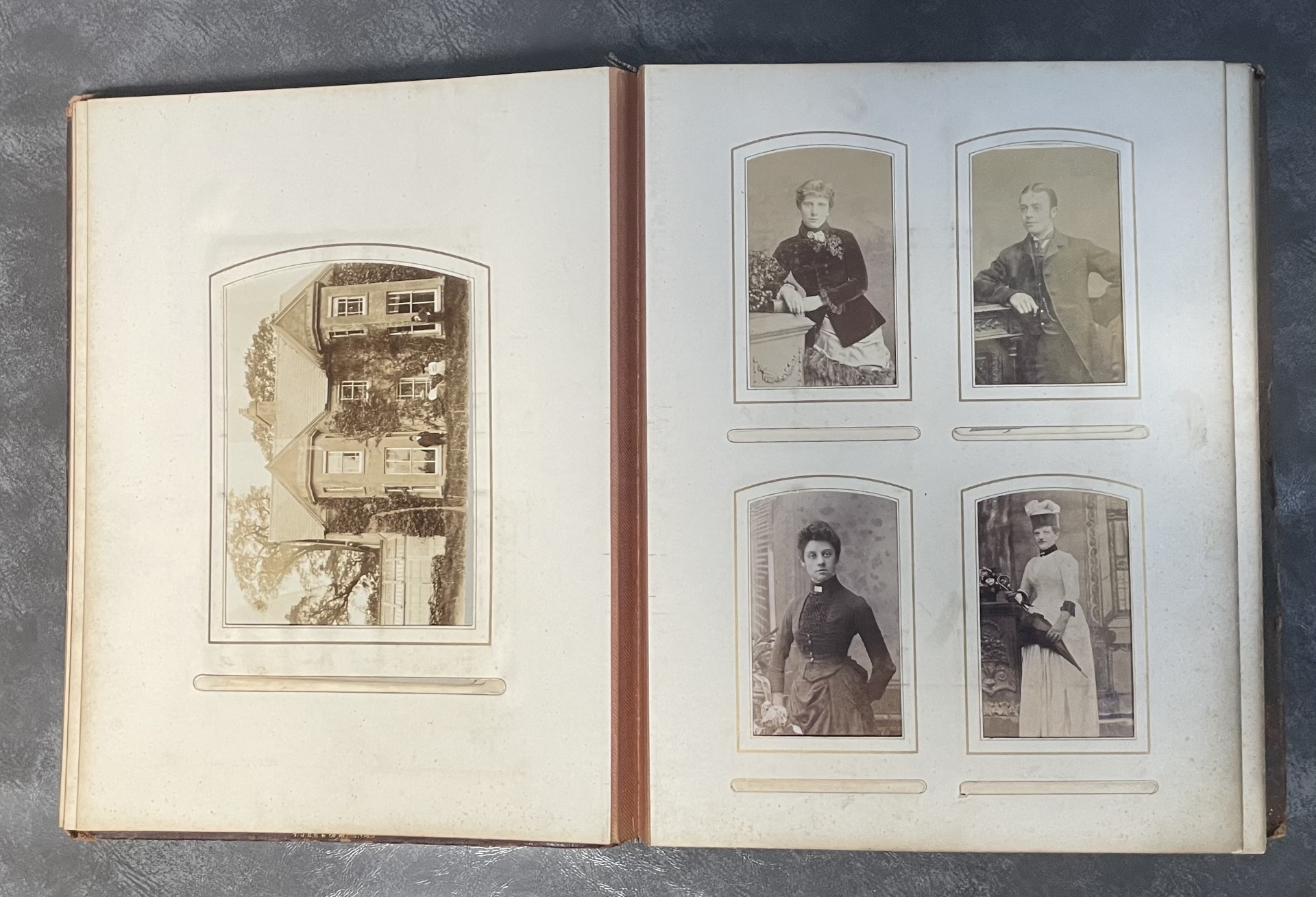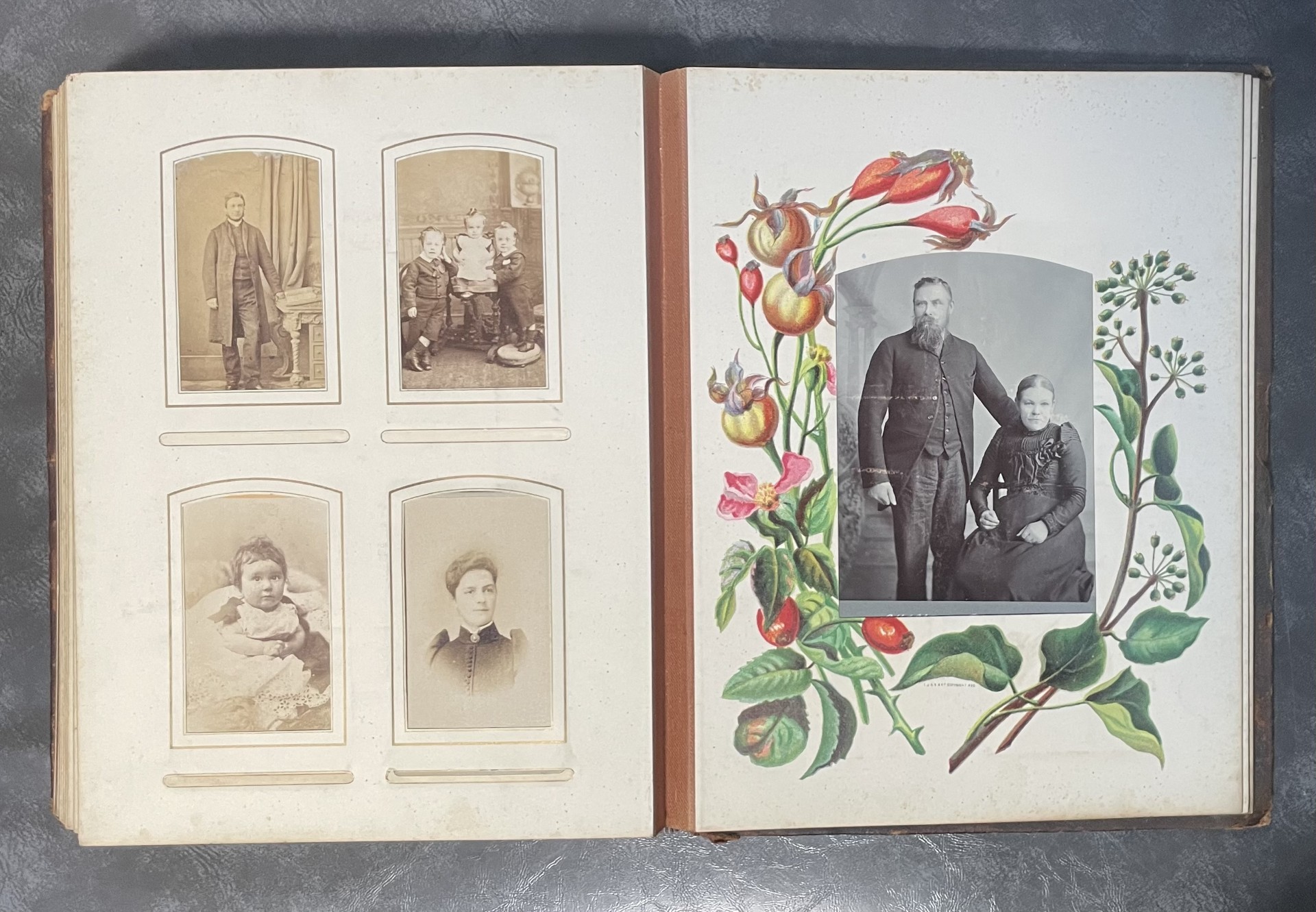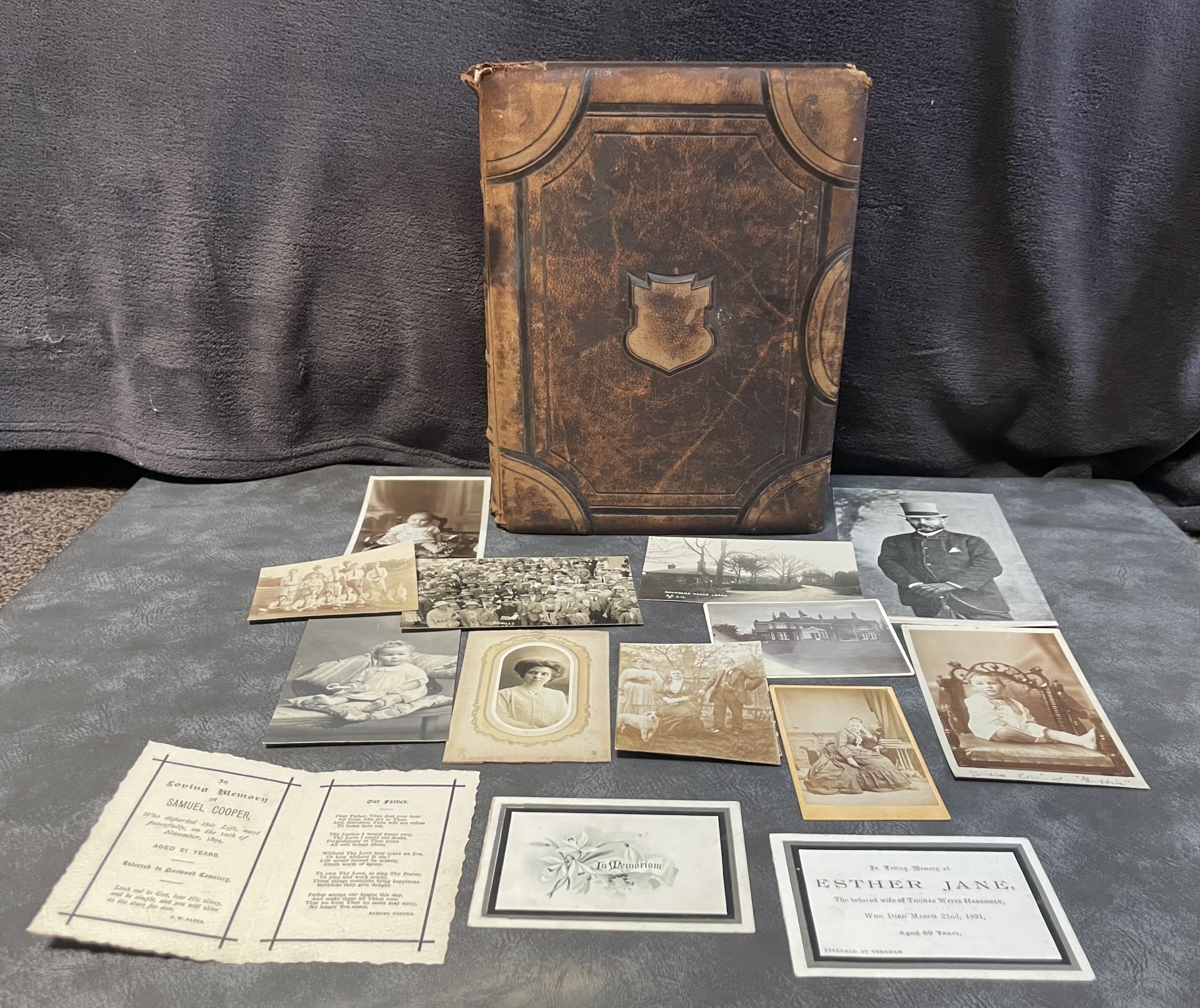 Large heavy 19th Century leather-bound album overflowing with fascinating photographs, plus a few interesting memoriam cards.