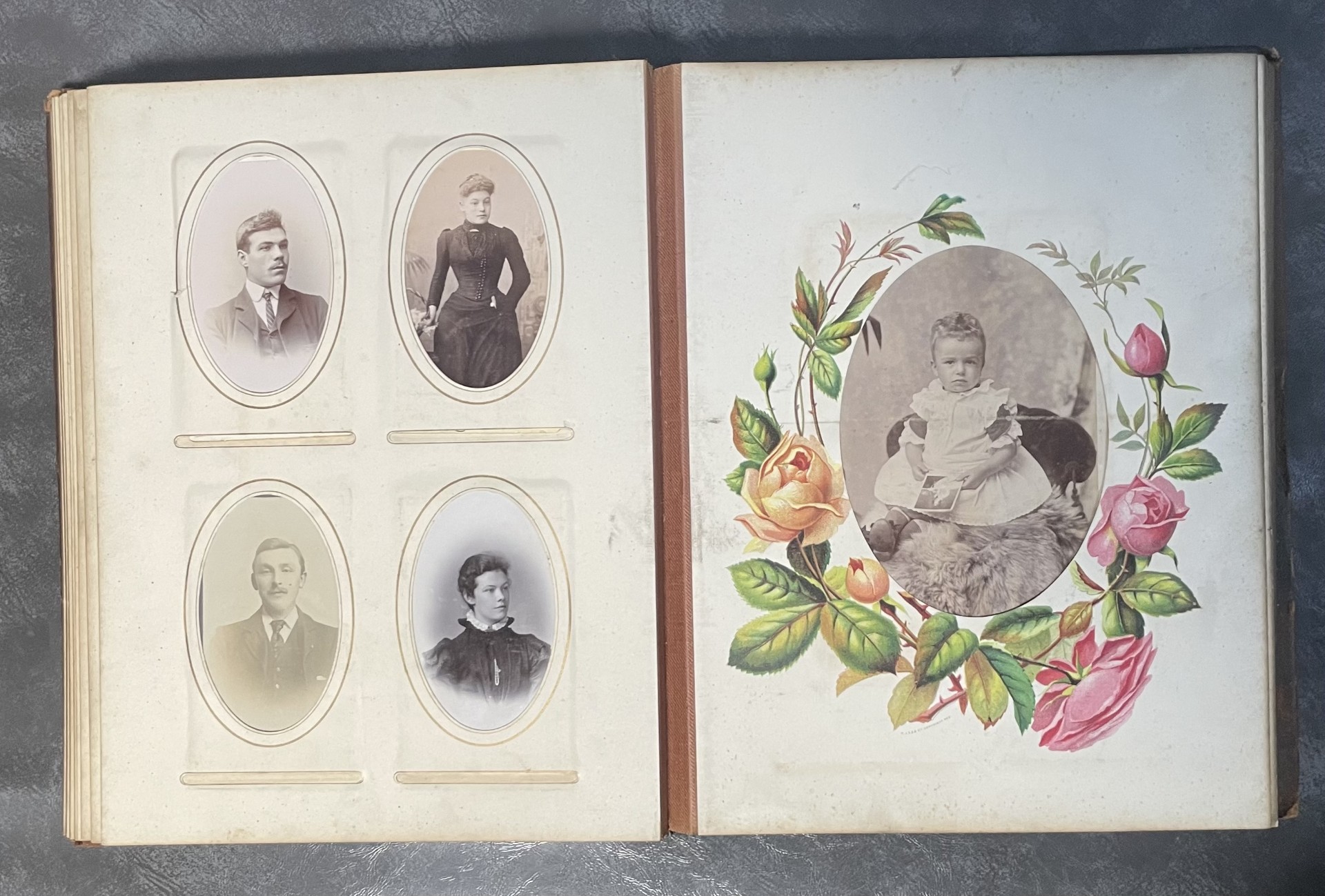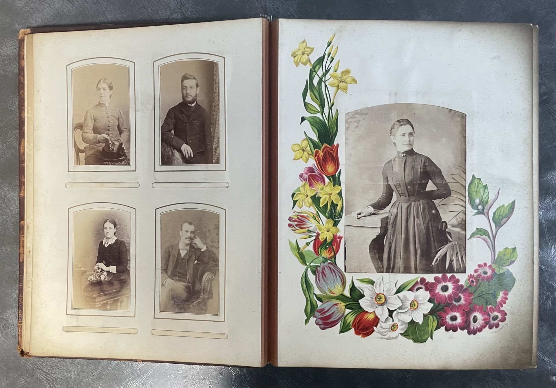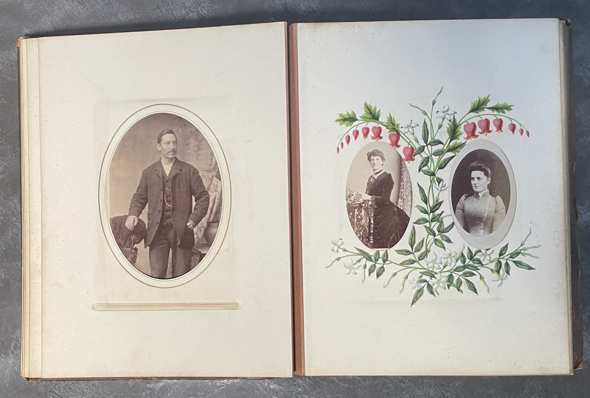 Large heavy 19th Century leather-bound album overflowing with fascinating photographs, plus a few interesting memoriam cards.