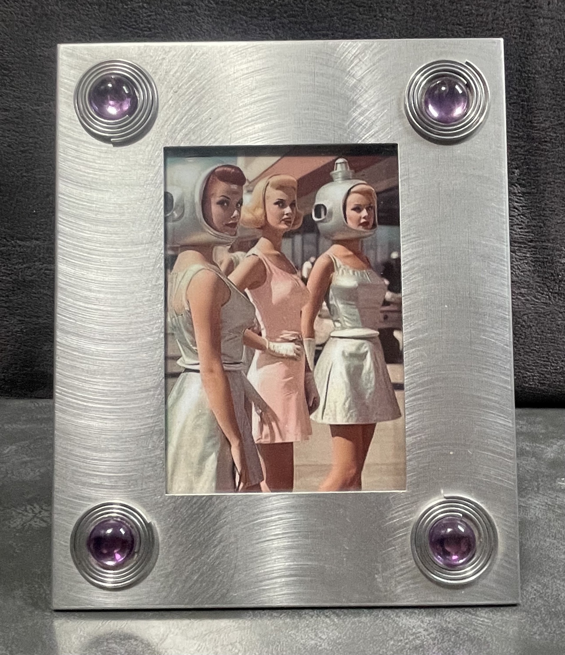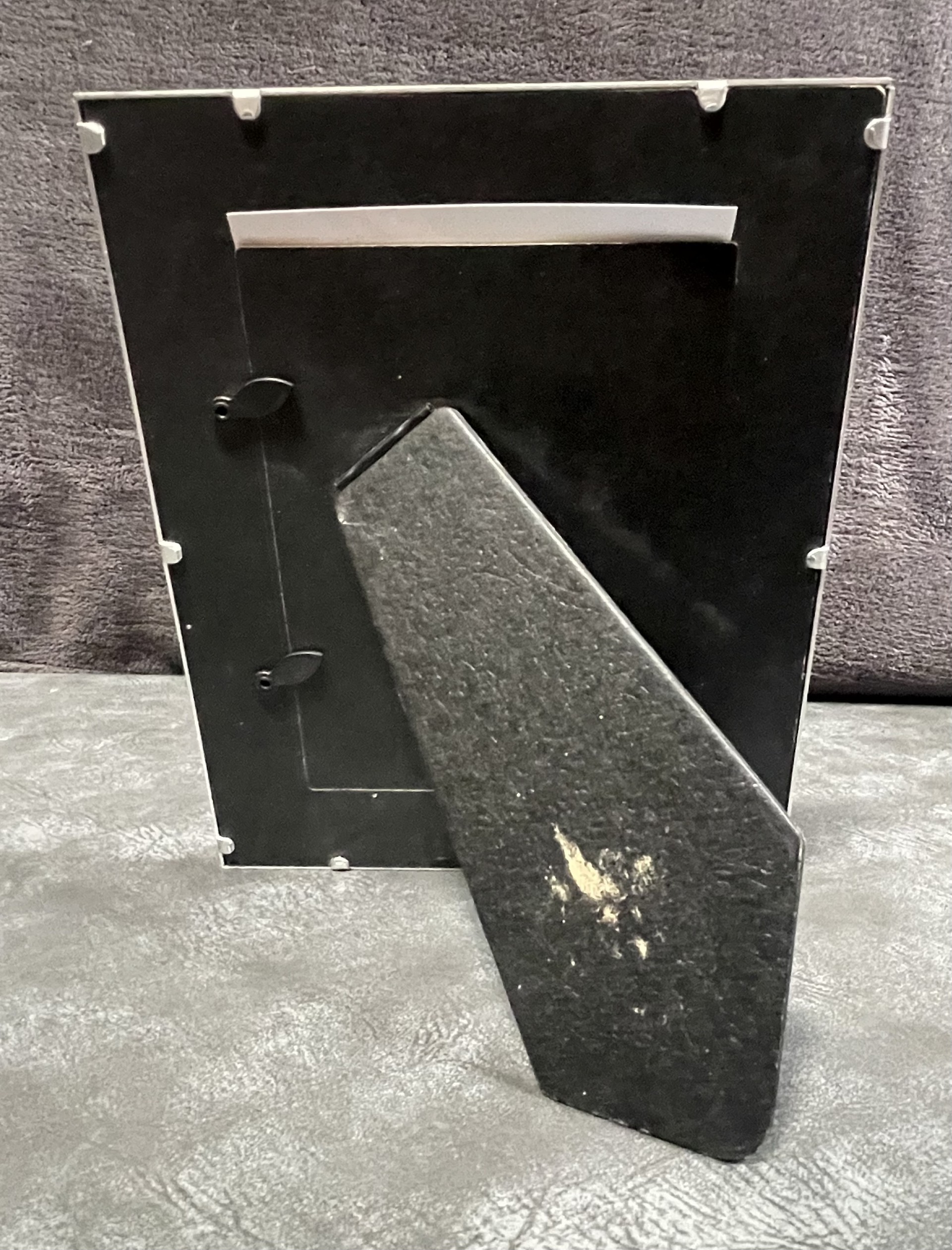 In free-standing frame that also has a hook if you’d like to wall it instead.