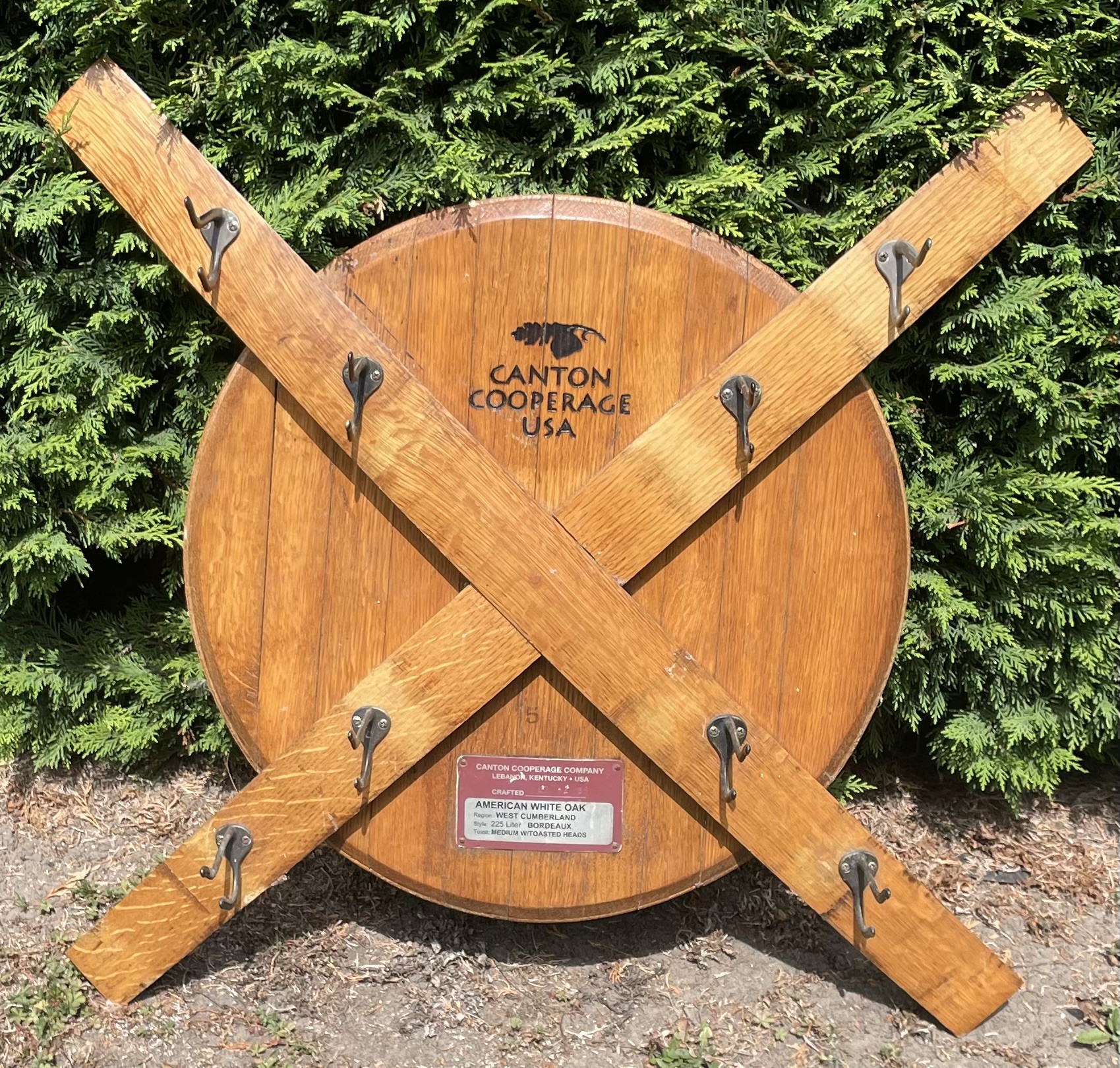 Very rare USA coat rack crafted from a Canton Cooperage wine barrel lid.