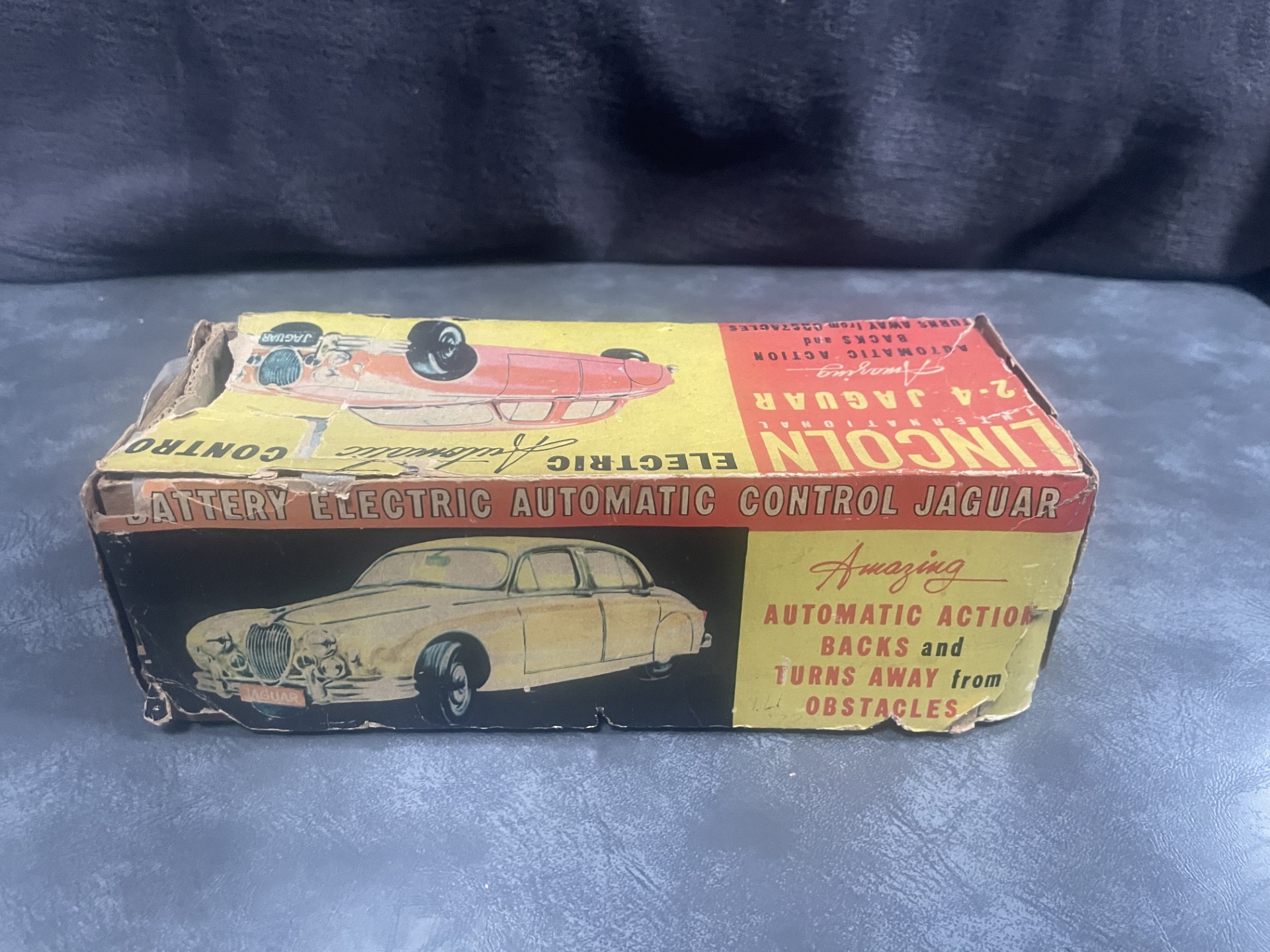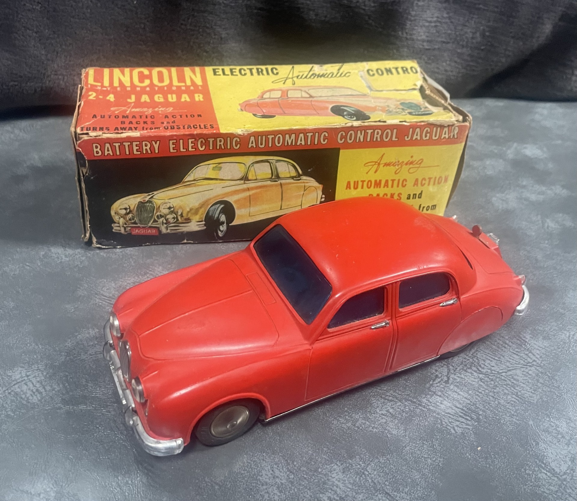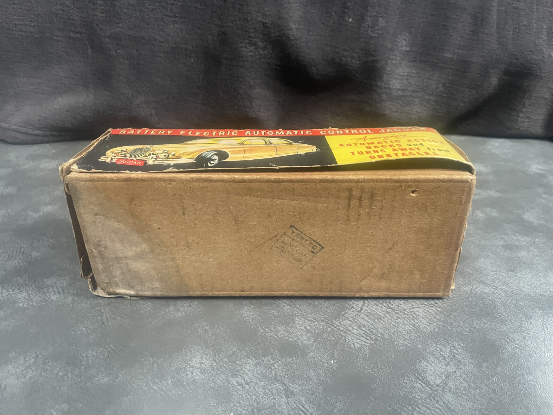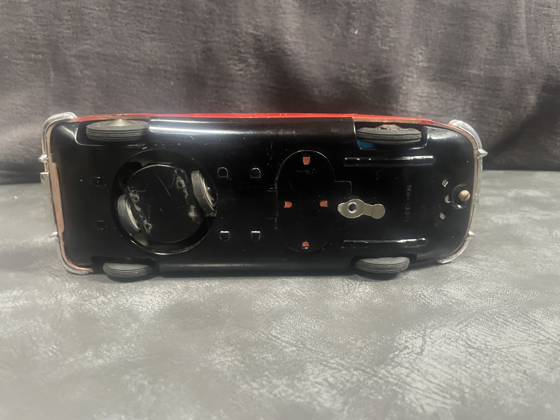 The small battery powered motor was made in Japan. The chassis is tin plate with a composite plastic body, which is in excellent condition for age.